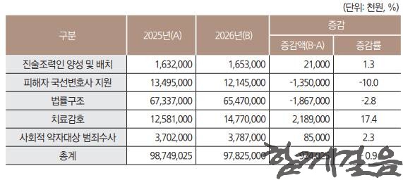반면, 피해자 국선변호사 지원과 법률구조 예산은 각각 10.0%, 2.8% 감소했다. 이에 따라 향후에는 법률 지원 서비스의 접근성과 지원 범위를 어떻게 안정적으로 유지할 것인지가 과제로 남는다.