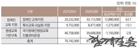 반면, 특수교육 내실화 지원 예산은 13.1% 감소했고, 국가장애인평생교육진흥센터 운영 예산도 2.8% 줄었다. 이는 일부 사업 구조 조정과 집행 여건을 반영한 조정으로 해석된다. 다만 평생교육과 성인 장애인의 학습권 보장이 중요한 과제로 남아 있는 만큼, 향후 관련 정책과 예산 흐름에 대한 지속적인 점검이 필요하다는 의견도 제기된다.