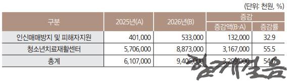 먼저 ‘인신매매방지 및 피해자지원’ 예산은 5억 3,300만 원으로, 전년도 4억 100만 원 대비 1억 3,200만 원(32.9%) 증액됐다. 성매매·성착취·노동착취 등 다양한 형태로 나타나는 인신매매 범죄의 심각성과 피해자 보호 필요성을 고려한 증액으로, 상담·신고 접수·구조 지원비 지급 등을 포함한 피해자 지원 체계를 운영하기 위한 것이다.
