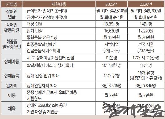 2026년도 예산이 확정됨에 따라 장애인 당사자 및 관련 종사자들에게 달라지는 내용을 표로 정리한다.