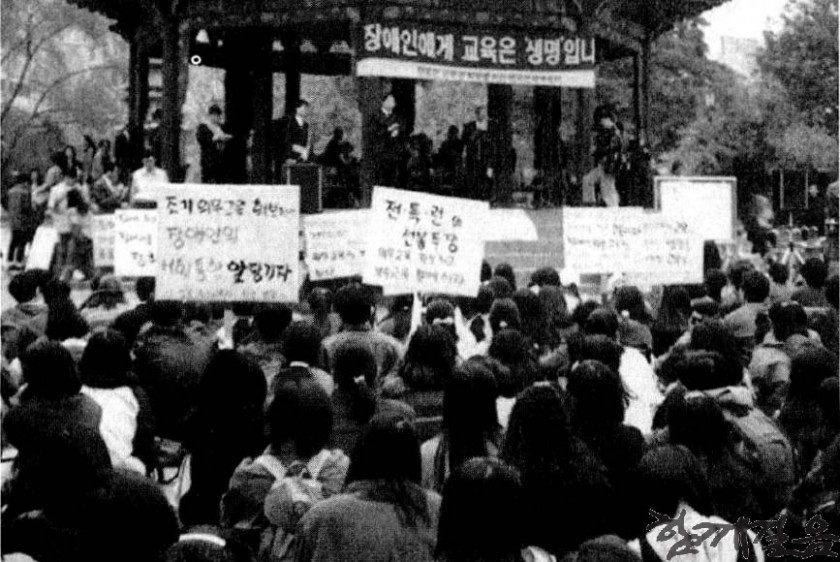 △ 1993년 11월 6일 '장애인교육법제정을 위한 범국민 대회' 모습. "장애인에게 교육은 '생명'"이라는 포스터가 걸려있다.