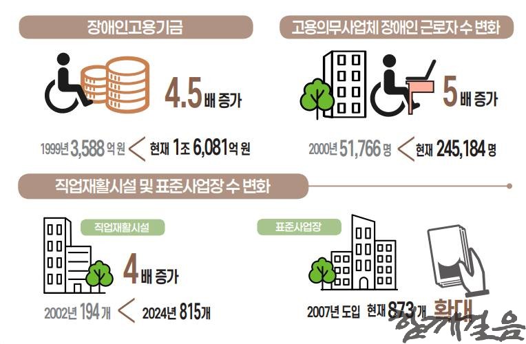 우선 장애인 고용을 둘러싼 외형적 수치는 크게 달라졌다. 장애인고용기금은 3,588억 원에서 1조 6,081억 원으로 약 4.5배 늘었다. 고용의무사업체에서 일하는 장애인 근로자는 51,766명에서 245,184명으로 약 5배가량 증가했으며 직업능력개발훈련 수료생도 141명에서 2,826명으로 20배 늘었다. 현재 4,405명의 장애인 근로자가 사업체에서 근로지원인제도를 이용해 일하고 있다. 직업재활시설은 2002년 194개소에서 2024년 815개소로 4배 이상 늘었고, 2007년 도입된 표준사업장 제도는 현재 873개소로 확대됐다. 고용의무 사업체 장애인 고용률도 1.1%에서 3.21%로 높아졌다. 장애인 임금근로자 월평균 임금은 79만 원에서 206.5만 원으로 늘었다.