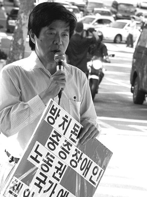 | ▲지난 9일 기획예산처 앞에서 '장애우 노동권 쟁취!일반예산 확보를 위한 결의대회'가 있었다. 이 집회에 참석했던 사이또는 ˝장려금 축소는 절대로 용서할 수 없는 일이라면서 한국에서 일본에서 아시아에서 그리고 세계에서 장애우 노동권 확보를 위해 같이 투쟁하자˝고 외쳤다. |