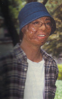 "태어난지 7개월쯤 되었을 때라고 들었어요. 단칸방에 살 때였는데 방문을 열면 바로 연탄아궁이가 있었대요. 기어다니다가 문 열고 나가면서 불을 갈려고 연탄을 빼놓은 아궁이에 장난감을 빠뜨렸었나봐요. 장난감을 꺼내려고 하다가 빨갛게 달아오른 아궁이에 머리가 빠저 3도화상을 입게 됐어요. 가까운 병원으로 갔다가 큰 병원으로 여기 저기 옮겨다니다가 결국에는 서울에 있는 병원까지 오게 됐어요. 다섯 살 때부터 1년에 한번씩 세차례 성형수술을 받았지만 워낙 얼굴 전체에 화상을 입어서 결과가 좋지 못했죠."