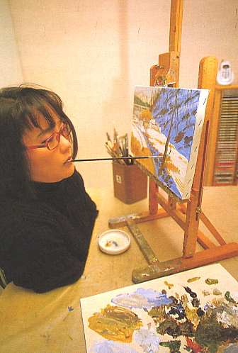 누군가 동양화물감을 사줘 물을 이용해 비교적 손쉽게 접할 수 있는 동양화와 수채화부터 시작했다. 그러나 동양화는 붓을 눕혀서 그려야 한지 위에 골고루 우러나오는 것이었다. 그런데 입으로 붓을 눕혀 그리다보면 물이 밑으로 줄줄 흘러 너무도 힘들었다.