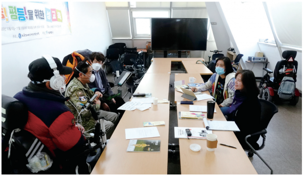 ↑취재가 진행된 자리의 모습. 왼쪽 아래부터 시계 방향으로 추경진 강사(헤드폰을 쓴 이), 활동지원사, 김탄진 강사, 한광주 강사, 강희석 강사가 대화를 나누고 있다.