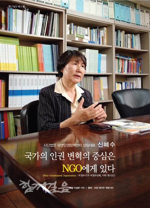 유엔장애인권리협약 민간보고서 작성을 위해, 수많은 단체들의 역량을 한데 모으고자 24시간 바쁜 일정을 소화하고 있는 ‘그’를 만났다. 한국정신대문제대책협의회 상임대표와 유엔여성차별철폐위원회 부의장을 역임했고, 현재 유엔사회권위원회 위원직을 수행하고 있으며, 사단법인 유엔인권정책센터(Korea Center for United Nations Human Rights Policy : 약칭 KOCUN, 이하 ‘코쿤’)를 이끌고 있는 신혜수 상임대표가 이번 만남의 주인공이다.