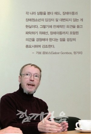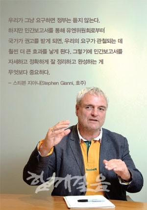 세계 인류의 15%를 차지하는 장애인의 권리 보호를 위해, 유엔 회원국 192개 국가가 지키기로 약정을 맺은 것이 바로 ‘유엔장애인권리협약(CRPD)’이다. 이 협약은 2008년 5월 3일 20개국이 비준함으로써 국제법으로 발효되기 시작하여 현재 138개국이 비준하였고, 한국 정부도 2008년 12월에 비준하여 지난 2010년에 첫 국가보고서를 제출한 뒤 현재 그 심의를 기다리는 중이다. 장애인권리협약의 이행주체는 물론 정부가 되지만, 보다 정확하고 핵심적인 실제내용을 보고서에 담는 것은 시민사회단체(NGO)가 작성해서 별도로 제출하는 ‘민간보고서’이다. ‘국가보고서’는 정부가 가릴 건 가리고 내보이고 싶은 부분에 집중하는 반면, 민간보고서는 정부가 가려둔 부분의 실체까지 가감 없이 드러낸다는 점에서 국내 시민사회단체의 역량과 집중적인 노력이 필요한 시점이기도 하다. 유엔장애인권리위원회에서 국가보고서 심의를 받은 국가가 현재까지 10개국에 불과하기 때문에, 보다 체계적이고 효과적인 대응방안을 함께 공유하고자 지난 11월 말 서울에서 ‘장애인권리협약 이행증진을 위한 국제 워크숍’이 개최되었다. 이에 이미 국가보고서 심의를 받은 국가의 전문가들이 전하는 생생한 조언을 함께 듣고자 한다. 호주장애인단체연맹의 매니저 스티븐 지아니 씨와 유엔장애인권리위원을 역임한 헝가리의 가보 곰보스 씨를 <함께걸음>이 만났다. 대담의 통역은 이리나 전국장애인부모연대 국제협력국장이 큰 수고를 담아주셨다.
