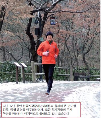 초기엔 저시력자와 전맹의 당사자가 짝을 이뤄 달렸는데, 아무리 조심하며 뛰어도 부딪치고 넘어지는 일이 다반사였다고 한다. 그렇게 3년여의 시행착오를 거듭하던 한국시각장애인마라톤은, 마라톤 국가대표 출신인 안기형 감독을 만나면서 획기적인 변화와 발전을 맞이하게 된다. ‘그냥’ 달리기가 아닌, ‘체계적인’ 관리와 훈련의 마라톤으로 다시 태어나게 된 것이다.