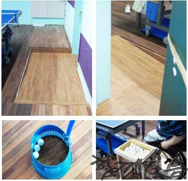 △ 스카이탁구클럽의 출입구 경사로, 공 줍는 도구, 선반
