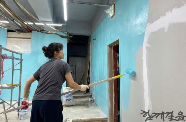 △ 공사하는 모습, 정진미 설립자가 페인트칠을 하고있다.(사진제공. 스카이탁구클럽)