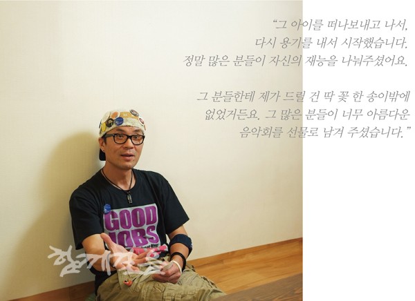 신부님께서 그에게 해주셨던 말씀처럼, ‘심장병 어린이’라는 존재를 만나게 된 건 달란트와 같은 인생의 인연이 아니었나 하며 지금도 떠올리게 된단다. 그 아이들을 돕기 위해서 고장이 난 앰프와 스피커를 고쳐 성당 들머리에 섰고, 그 자리에서 누군가의 노랫소리가 들리는 풍경은 ‘그때’부터 ‘그’로부터 지금까지 이어져 오게 된 셈이 된다. 처음 만나게 된 아이를 돕고 치료하기 위해 열심히 준비하고 활동했지만, 그 아이는 결국 그해 겨울에 먼 길을 떠나고 말았단다. 숨 쉬는 것 자체가 어려웠던 그 아이는 뭘 갖고 싶은지 물으면 늘 작은 무언가를 얘기했기에, 그는 꼭 이렇게 답해 줬다고 한다. ‘알았다. 그거 아저씨가 한번 구해볼게.’ 그리고 그걸 마련하기 위해, 다시 거리에서 기타를 치며 모금행사를 벌였다는 것. 그런데 어느 날 그 어린 아이가 ‘연례행사’라는 표현을 썼단다. ‘아저씨, 왜 추울 때만 사람들이 이렇게 많이 오죠?’ 하면서.
