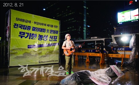 대화의 분위기를 바꿨다. 독자 여러분들이 박준 씨를 가장 많이 만나는 곳은 다름 아닌 거리의 현장 아닌가. 그렇다면 무대에서 여러 분들을 만나게 될 때는 어떤 마음으로 마주하게 되는지를 물었다. 무조건 식구 같단다. 그리고 무대를 무대라고 생각해 본 적이 없다고 한다. 무대의 눈높이가 싫기 때문이란다. 그래서 바닥에 늘 내려와서 함께 노래를 하게 된다고 한다. 무대라는 건 앞에 앉아 있는 장애인 동지들이 없으면 아무런 의미가 없는 건데, 무대라는 게 항상 커 보이는 게 싫어서 눈높이를 맞추고자 늘 아래로 내려가곤 한단다. 무대와 관중 또는 무대와 객석이란 이분법이 아니라, 함께해야 하고 함께하겠다는 그 마음을 나누는 공간이어야 하며, 자신 스스로도 장애인 주체이기에 더더욱 함께해야 한다는 마음을 앞세우게 된다고 했다.