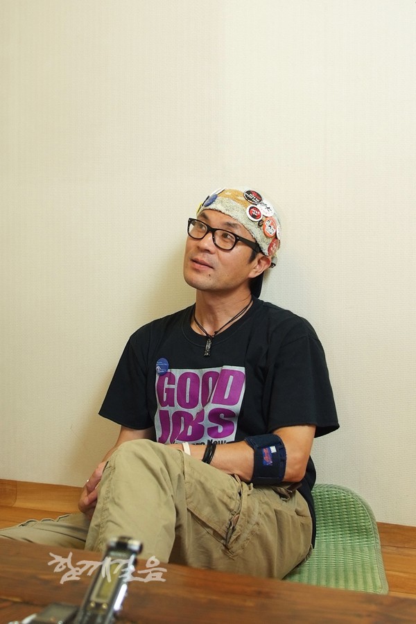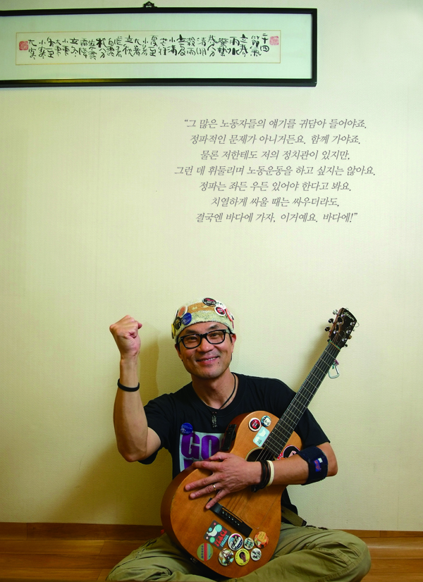 화제를 또 바꿨다. 그의 몸 여기저기에는 항상 수많은 배지가 달려 있다. 기타 케이스에도, 기타 표면에도 형형색색의 배지들이 늘 가득하다. 이걸 다 어디서 구한 건지 물었다. 전부 다 현장에서 주신 거란다. ‘우리 배지도 달아주소!’ 하며 하나씩 건네받았던 것들이 모이고 쌓여, 지금의 모습을 만들었다는 얘기였다. 배지 하나씩의 설명이 잠시 뒤따랐다. 설명 중에 옥란이(고 최옥란 열사)와 똑같은 걸 함께 달았던 거라며 가리킨 하나의 배지가 인상적이었다. 그럼 왜 이렇게 많이 달고 다니는가? 이게 다 홍보란다. 자기 자신의 홍보가 아니라, 그 현장과 그 싸움과 그 투쟁을 대외적으로 상기시키는 수단으로 이 배지들을 활용한다는 것이다.