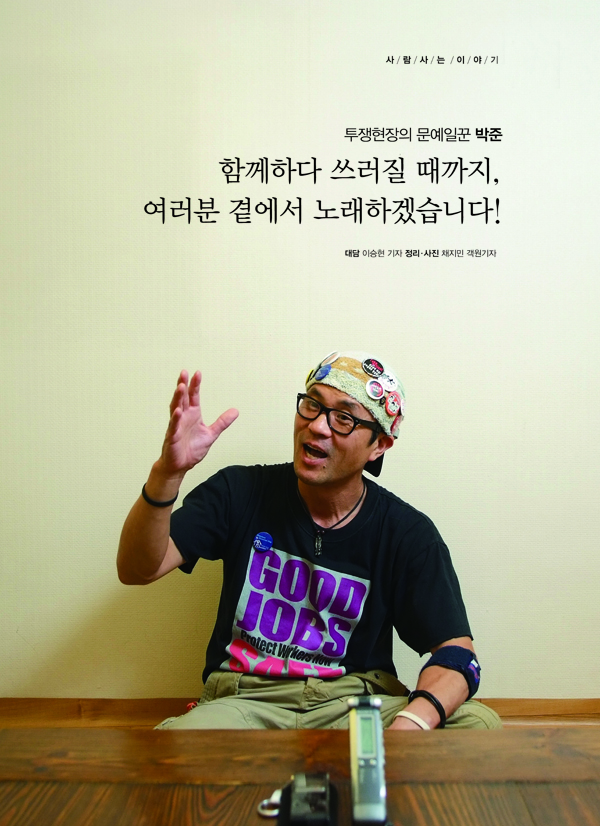 박준 씨를 만날 수 있는 곳은 기름지고 흥겨운 자리가 아닌, 소외되고 차별 받는 이들이 싸움을 벌이는 장소뿐이다. 처음에도 물었지만 다시 물어 보았다. 왜 그들과 함께하는 삶을 살고 있는가? 문예일꾼의 역할이 그것이기에 이렇게 살아간다고 했다. 문예일꾼의 역할은 여러 가지가 있겠지만, ‘나’를 나타내기 위해 올라가는 게 아니고 지쳐 있는 동지들을 격려하기 위함이란다. ‘내 노래를 들어주소!’가 아니라 그들에게 힘을 전하기 위해 뛰는 것이고, 그들로부터 힘을 얻으며 다음 노래를 부르게 된다는 것이다. 함께하는 사람들의 마음이라 생각한단다. 민주노총이든 한국노총이든 뭐든 간에, 그 안에 소속된 노동자들과 싸우는 동지들이 있으면 언제든 어디든 가야 한다며 늘 준비하고 있다 했다.