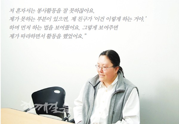 “제가 못하는 게 몇 가지 있지만…, 저 혼자서는 봉사활동을 잘 못하잖아요. 제가 못하는 부분이 있으면, 제 친구가 ‘이건 이렇게 하는 거야.’ 하며 먼저 하는 법을 보여줬어요. 그렇게 보여주면 제가 따라하면서 활동을 했었어요.”
