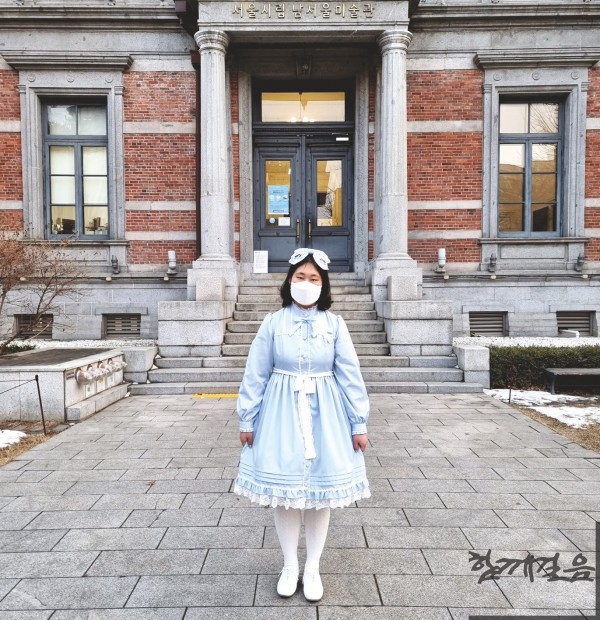 △ 서울시립남서울미술관에서 하늘색 원피스를 입고 포즈를 취하는 김마리 씨