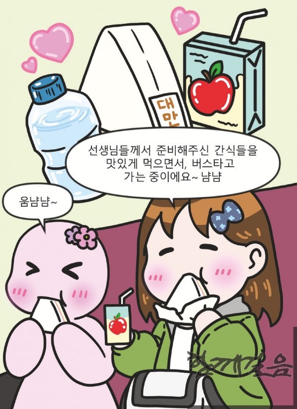 선생님들께서 준비해주신 간식들을 맛있게 먹으면서, 버스타고 가는 중이에요~ 냠냠