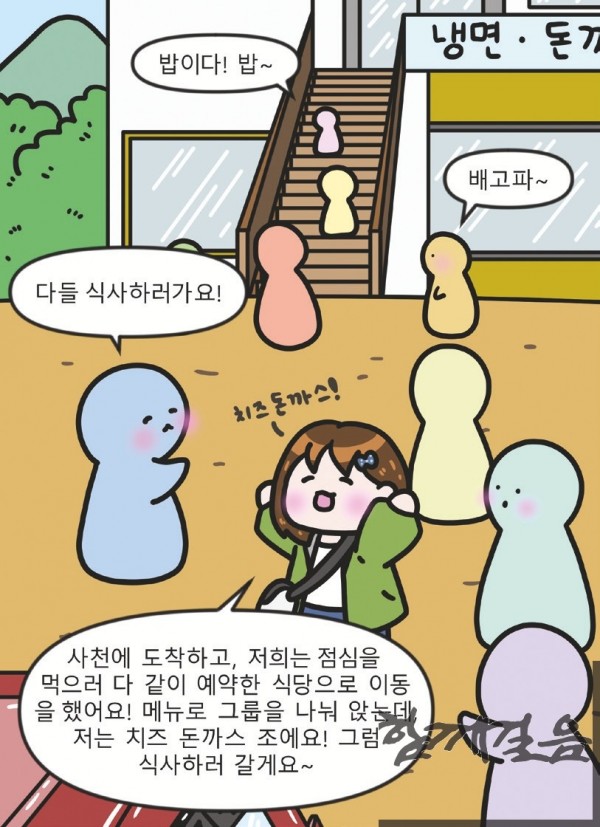 메뉴로 그룹을 나눠 앉는데, 저는 치즈 돈까스 조에요! 그럼 식사하러 갈게요~