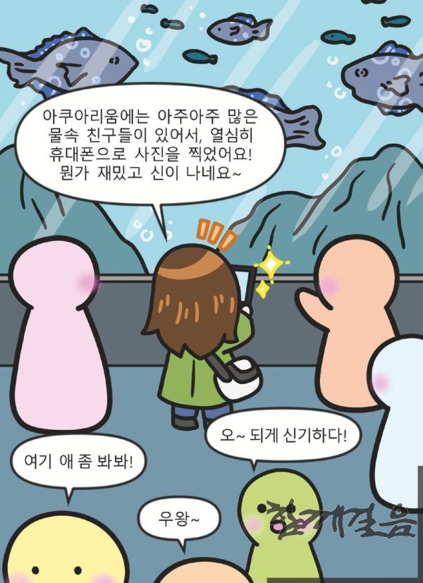 아쿠아리움에는 아주아주 많은 물 속 친구들이 있어서, 열심히 휴대폰으로 사진을 찍었어요!