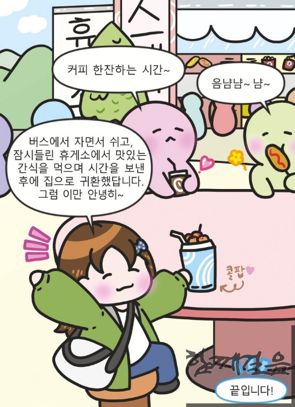 버스에서 자면서 쉬고, 잠시 들린 휴게소에서 맛있는 간식을 먹으며