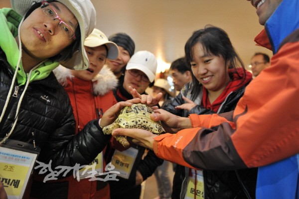 | ▲ 한국장애인고용공단 임직원으로 구성된 ‘디딤도리’ 사회공헌단이 발달장애인과 함께 떠난 ‘가을단풍 힐링여행’ 중 발달장애인들이 거북이 등을 만지며 즐거워하고 있다. | ||