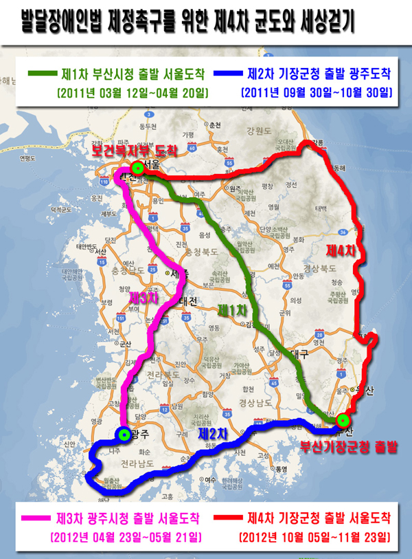 | ▲ 발달장애인법 제정 촉구를 위한 균도와 세상걷기 이동경로 | ||