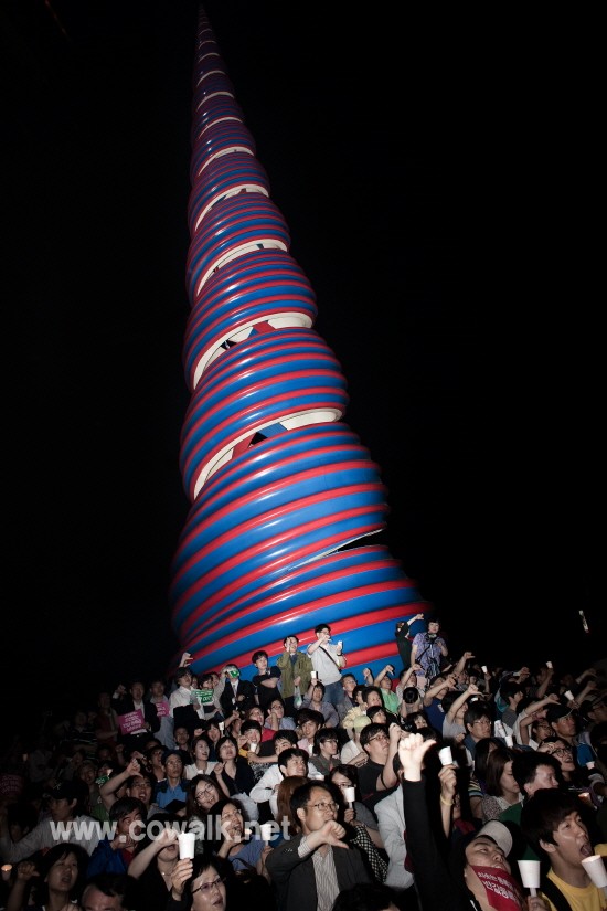 사람들은 이명박 대통령이 이명박 시장이던 시절, 청계천에 세운 34억원짜리 소라탑 아래로 삼삼오오 모여들었습니다.