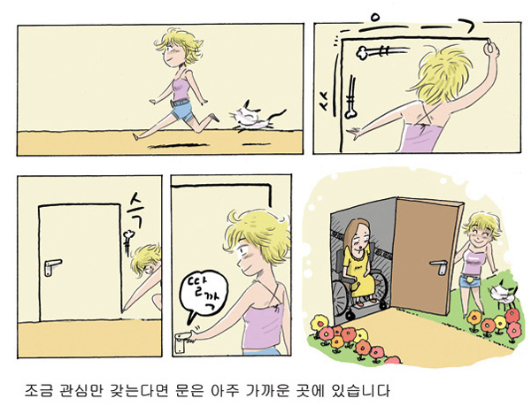 장애인이 일반 사회에서 온전한 삶을 살아가기 위해서는 사회와 대중의 작은 관심이 필요하다는 내용의 장애인 인권 웹툰을 선보이자 네티즌들은 ‘만화를 통해 마른 눈물을 흘릴 수 있는 좋은 기회’, ‘장애인 인권에 대해 다시금 생각할 수 있는 계기가 되었어요’, ‘초등학생들이 장애인이란 단어를 욕으로 사용한다는...큰 자각이 될 것 같아요’ 등 큰 관심을 보였다.