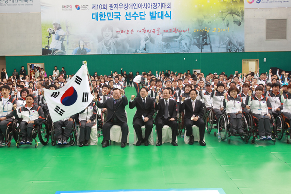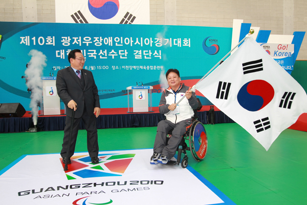 제 10회 광저우 아시아장애인경기대회에 출전할 한국선수단은 지난 6일 경기도 이천장애인종합훈련원에서 300여명의 내 외빈이 참석한 가운데 결단식을 갖고 굳은 각오를 다졌다.