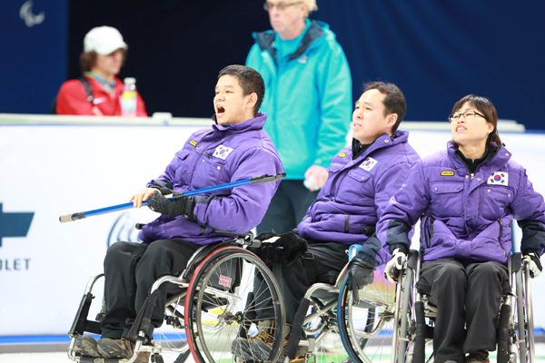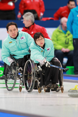 다음은 구기종목에서는 처음으로 메달을 획득하며 한국 장애인동계올림픽의 새로운 역사를 써내려간 한국 휠체어컬링 대표팀의 스위스, 캐나다(예선), 미국과의 경기모습이다.