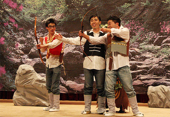 | 지적장애인 연극 모임 ‘무지개’의 정기공연이 지난 1일 5·18기념문화회관에서 열렸다. (왼쪽부터) 배우 나정문(나르키소스 분), 양정태(미켈로분), 김광중씨(마루아 분)가 사냥 장면을 연기하고 있다. | ||