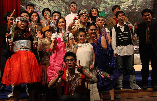 | 극단 ‘무지개’ 단원들이 공연을 끝내고 단체 사진 촬영에 즐거워하고 있다. | ||