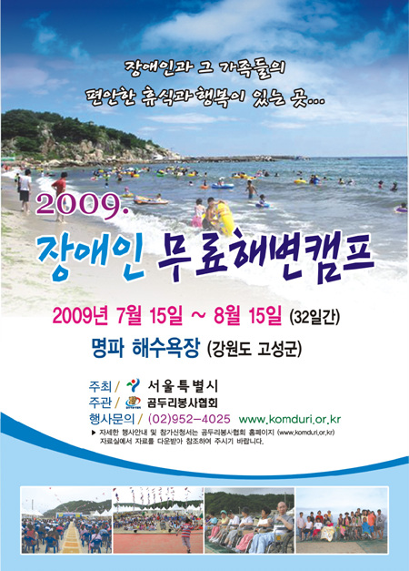 ‘2009 장애인 무료해변캠프’가 오는 8월 15일까지 강원도 고성군 현내면 명파리 명파해수욕장에서 개최된다.
