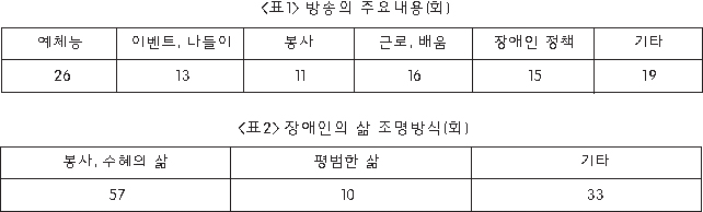 <표1>에서 보는 바와 같이 작년 11월부터 2009년 5월 현재까지 방영된 100회분의 내용을 분석한 결과, 장애인이 일하고 배우는 평범하면서도 의욕적인 삶의 모습보다는 3월16일 방송된 ‘좋은 이웃 실버 인형극단’ 편에서 보듯이 비장애인 공연단들이 장애인시설을 찾아 위문공연을 한다거나 1월19일 ‘우리들의 즐거운 기차여행’ 편처럼 장애인들이 봉사들의 온갖 도움을 받으며 여행을 떠나는 모습(39회) 등을 방영하면서, 정작 장애인들에게 가장 중요한 사회정책 분야는 15회 정도 밖에 할애를 하지 않고 있었다.