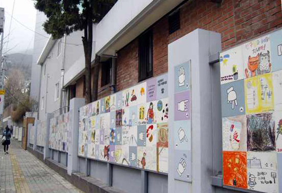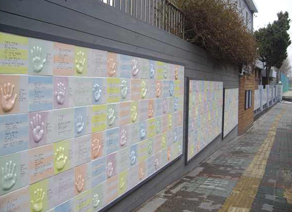 서울맹학교 담장에 설치된 이 점자벽화는 참여한 학생들의 핸드 프린팅과 점자로 새겨 넣은 소망의 글귀들이 파스텔 톤의 배경과 어우러져 온기를 불어넣은 듯, 골목 전체를 환하게 변신시켜 주고 있었다.