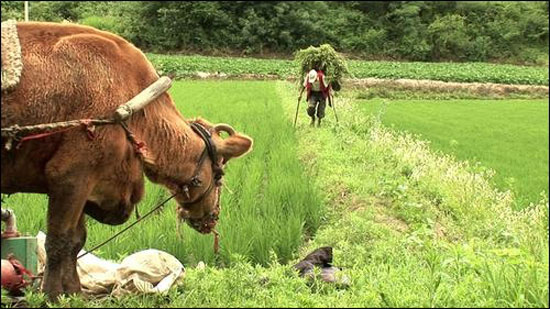 그래서 할아버지 할머니의 일상과 동선을 파악하는 데 오랜 시간을 바쳤고, 할아버지와 소가 다니는 길목이나 일하는 들녘에 카메라를 고정해 놓고 찍었다. 풀샷이나 롱샷이 많은 이유다.