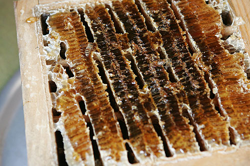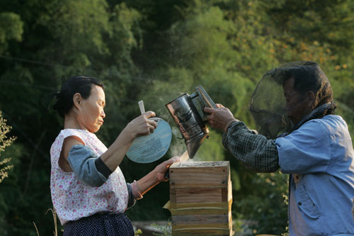 | 꿀을 뜬다. 봉해 둔 벌통을 열고 할아버지는 연신 연기를 뿜어내고 할머니는 부채로 연기를 다북다북 밀어넣는다. “벌들한테 피신허라고. 아래로 니려가라고.” ⓒ 김태성 기자 | ||