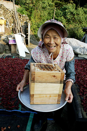 깨끗한 산골에서 난다고 이름을 얻은 논곡꿀. 뺑뺑 돌려 빈집이어서 절 속 같은 이 마을 열 집 중에 네 집 빼고는 다 벌을 키운다. 고치실댁에서 한봉을 해 온 지는 한 20년. 그간 ‘벌침’을 많이도 맞았다.