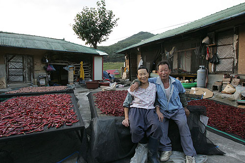 | 구례 논곡마을 뽁대기집. 50년을 함께 살아온 임양래·이단엽 부부. 두 내외가 둔정둔정 산비탈을 더터서 걷어온 밤이며 고추가 마당 한가득 널려 있다. “빵긋빵긋 이삐요 안.” ⓒ 김태성 기자 | ||