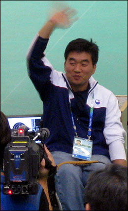 | ▲ 혼성 50m 권총 결승에서 금메달이 확정되자 박세균이 손을 흔들고 있다. ⓒ베이징/공동취재단 | ||