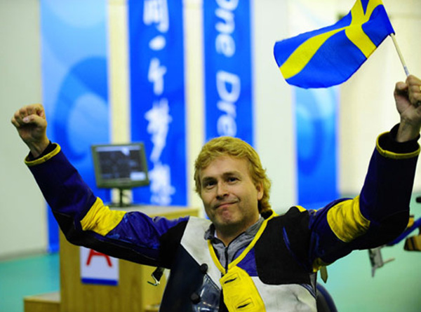 (BEIJING, September 8) -- Athens 2004 gold medalist Jonas Jacobsson of Sweden surpassed the eight-year-old world record by a huge margin this morning in the Men's 10m Air Rifle Standing Position in his disability class. Jacobsson's gold medal takes his Paralympic medal tally to 14 gold, one silver and eight bronze medals.