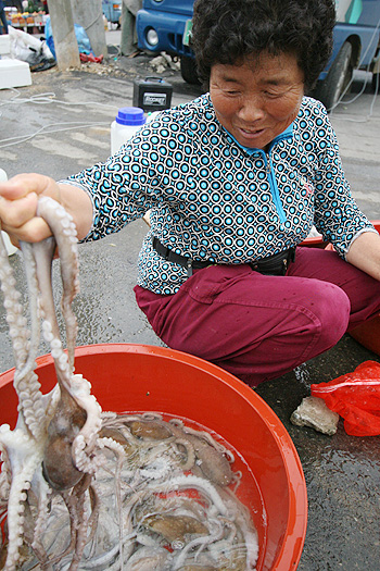 아주 작은 것에도 장사 수단이 숨어 있다. 낙지가 담긴 대야에는 갱물(바닷물)을 많이 부으면 안 된다. 낙지가 작게 보인다. 대야 속 고기가 훤히 들여다보여야 팔리는 법, 생물 담긴 대야에 일어나는 물거품을 제거하는 방법이 있다. ‘새우깡(과자)’이다.