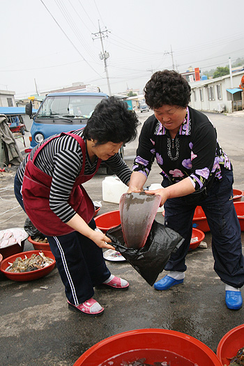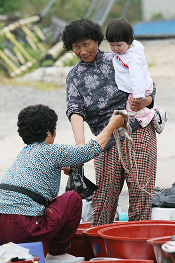 벽파리에서 온 손예자(69) 할머니. 한 아줌마가 화랑기 잡은 수고를 전하며 값을 묻는다. “이 놈을 잡을라믄 몇 구녁을 쑤셔야 한디, 많이도 잡았네. 나도 잡아봐서 알어. 이것도 잡을 줄 아는 사람이 잡제, 못 잡는 사람은 넘(남)의 집만 때려붓고 있어.”