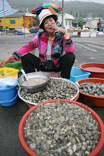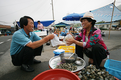 가장 먼저 ‘머리에 돈 문지르고’(마수걸이를 하고 오늘의 운을 비는 행동) 주머니에 집어 넣은 사람은 반지락장사 김하자(59)씨. “아짐은 물건도 잘 보고 사람도 잘 보요. 나 벌포에서 왔소.” 갯바닥 좋은 벌포 반지락이라는 것.