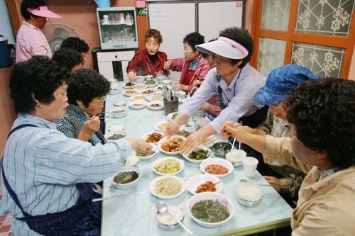 딱, 아침 6시 정각이다. 시장 앞에 있는 식당 ‘까치주점’의 주인 정일심(58)씨가 “밥들 묵어라” 하고 고함을 친다. 몇몇 상인들도 식당으로 들어서며 “아, 싸게싸게(빨리빨리) 달라들어” “늙은 언니야 언능(얼른) 온나” 하며 불러들인다.