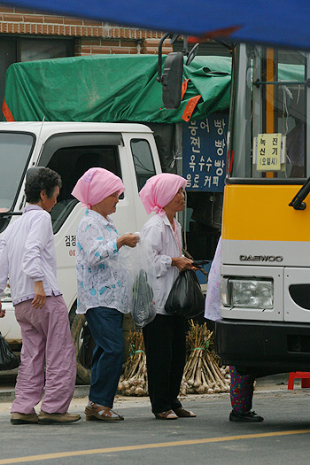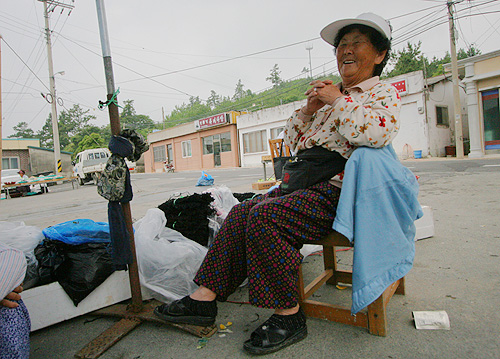 마늘이 많이 나왔다. 용달차로 채소를 파는 젊은 부부는 동종 업계 할머니들에게 요즘 마늘 양파 배추 시세 등 유통정보를 건네주기도 한다. 오늘 오일시장에 사람이 좀 보이는 것은 모내기 끝내고 잠시 숨 돌릴 때이기 때문. 옷전 상인도 “오서 옵쇼” 하며 목소리가 밝다.