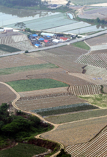 | ▲ 두봉산에 내려다본 마을과 밭, 논. ⓒ 김창헌 기자 | ||