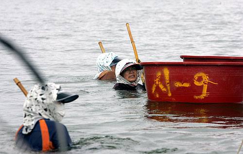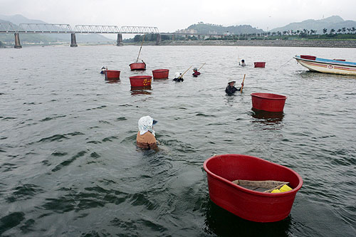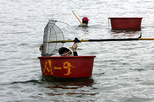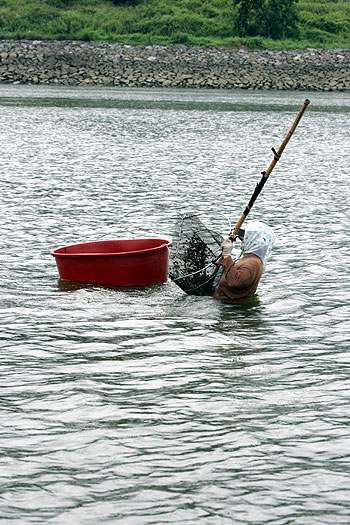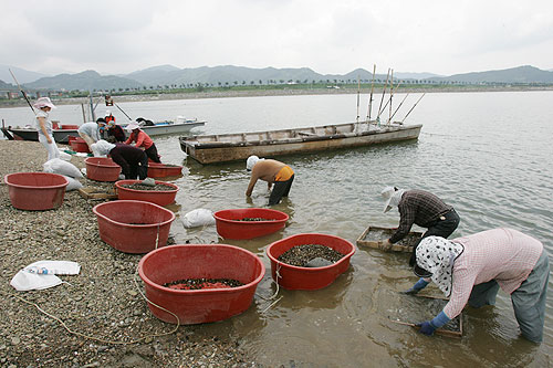 4월에서 10월까지 계속되는 이 곳 재첩잡이는 6∼7월에 절정을 이룬다. 워낙 공급량이 많아서 제값 받기가 힘들지만 작업은 계속된다.