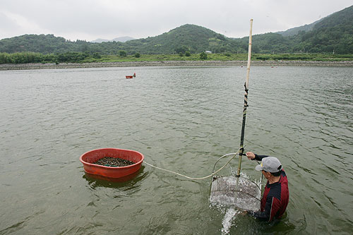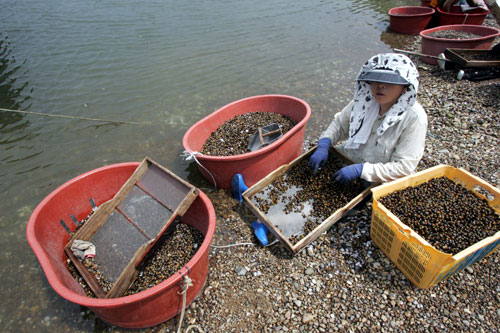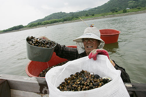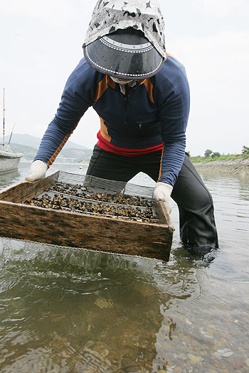 작업기간은 한 달 평균 보름 정도. 재첩을 거둬가는 중간상의 주문에 따라서 날마다 잡는 양이 정해진다. 오늘은 세 가마(세 말)인 90㎏다. 값싼 중국산 재첩들이 많이 나돌지만 섬진강 재첩은 맛에서 월등하게 차이가 난다. 판로는 걱정 없다.